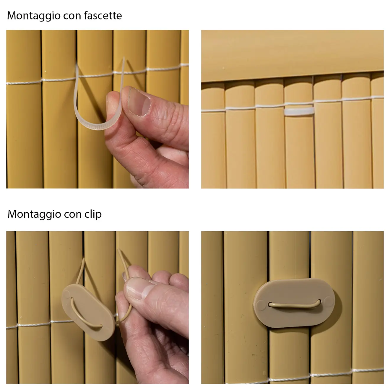 I punti di fissaggio qui rappresentati sono solo un suggerimento di montaggio. A seconda del tipo di recinzione, del terreno o del luogo di utilizzo, sono necessari ulteriori clip di fissaggio o fascette per montare i tappetini in modo sicuro in caso di carico di vento elevato. Puoi ordinare sia fascette che set di fissaggio da noi.