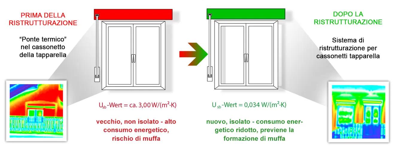 Con il sistema di ristrutturazione completa Kombi-Flex "TF" della casa DiHa, tutti i cassonetti delle tapparelle con revisione dal basso o dal davanti possono essere isolati successivamente in pochi semplici passaggi.