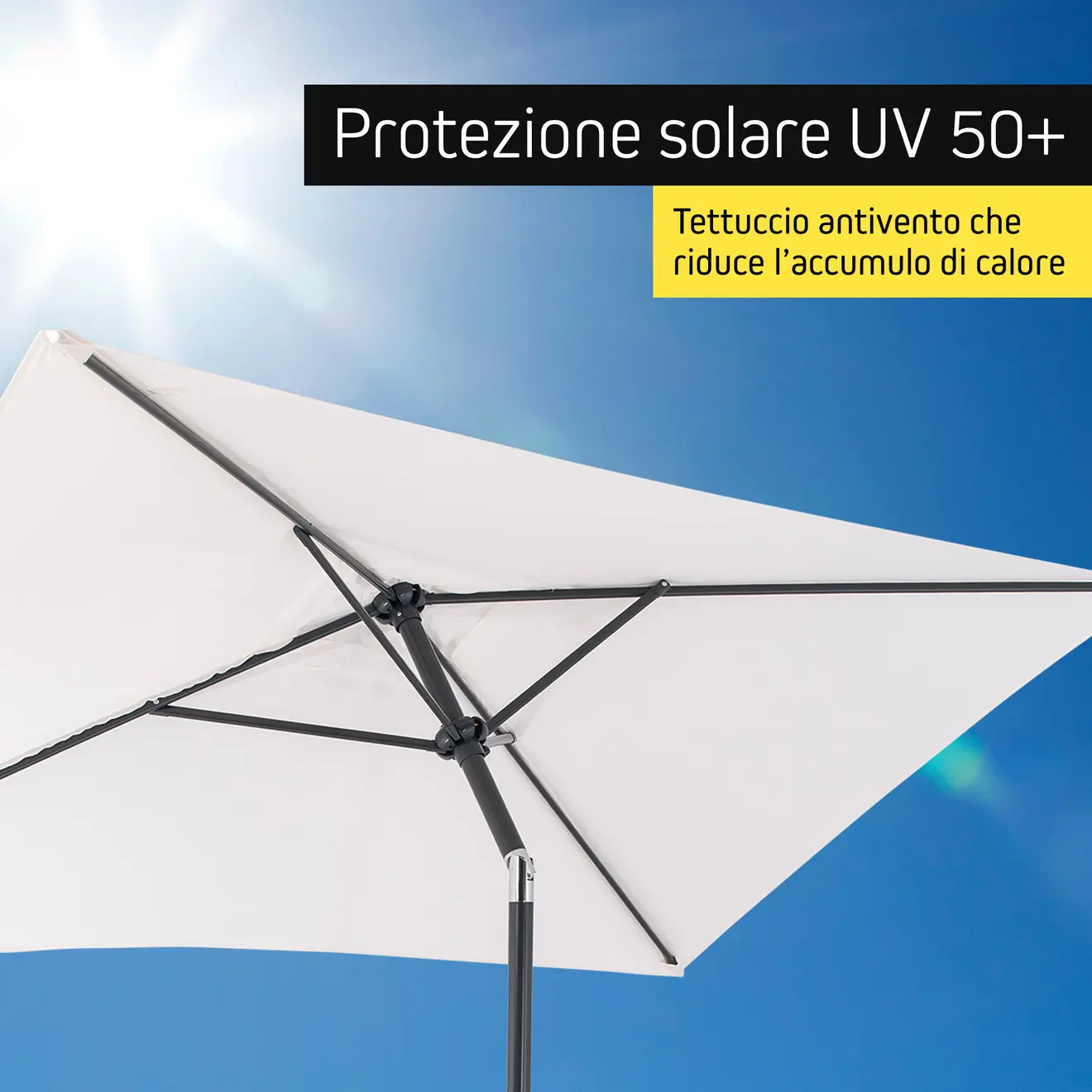 Gli ombrelloni piccoli e rettangolari sono attualmente di tendenza. Poiché balconi e terrazze sono anch'essi di forma rettangolare, offrono da un lato un'ombreggiatura ottimale e dall'altro sono un vero colpo d'occhio. La superficie del nostro modello parajuna è di 2,99 m², l'altezza totale è di 2,38 m. Il piccolo ombrellone è dotato di quattro stecche in acciaio e un palo in acciaio verniciato a polvere color antracite. Il funzionamento avviene tramite una manovella integrata.