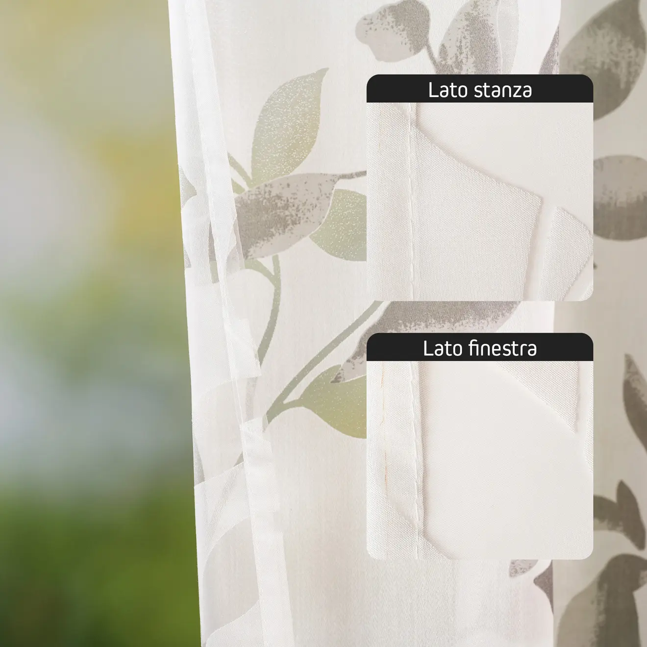 Il tessuto decorativo semitrasparente si presenta in un elegante bianco-grigio, che si adatta perfettamente a qualsiasi arredamento. La vera bellezza della tenda risiede nei dettagli raffinati. Un bordo burnout lavorato artisticamente e un delicato motivo a foglie conferiscono a questa tenda un'eleganza senza tempo.