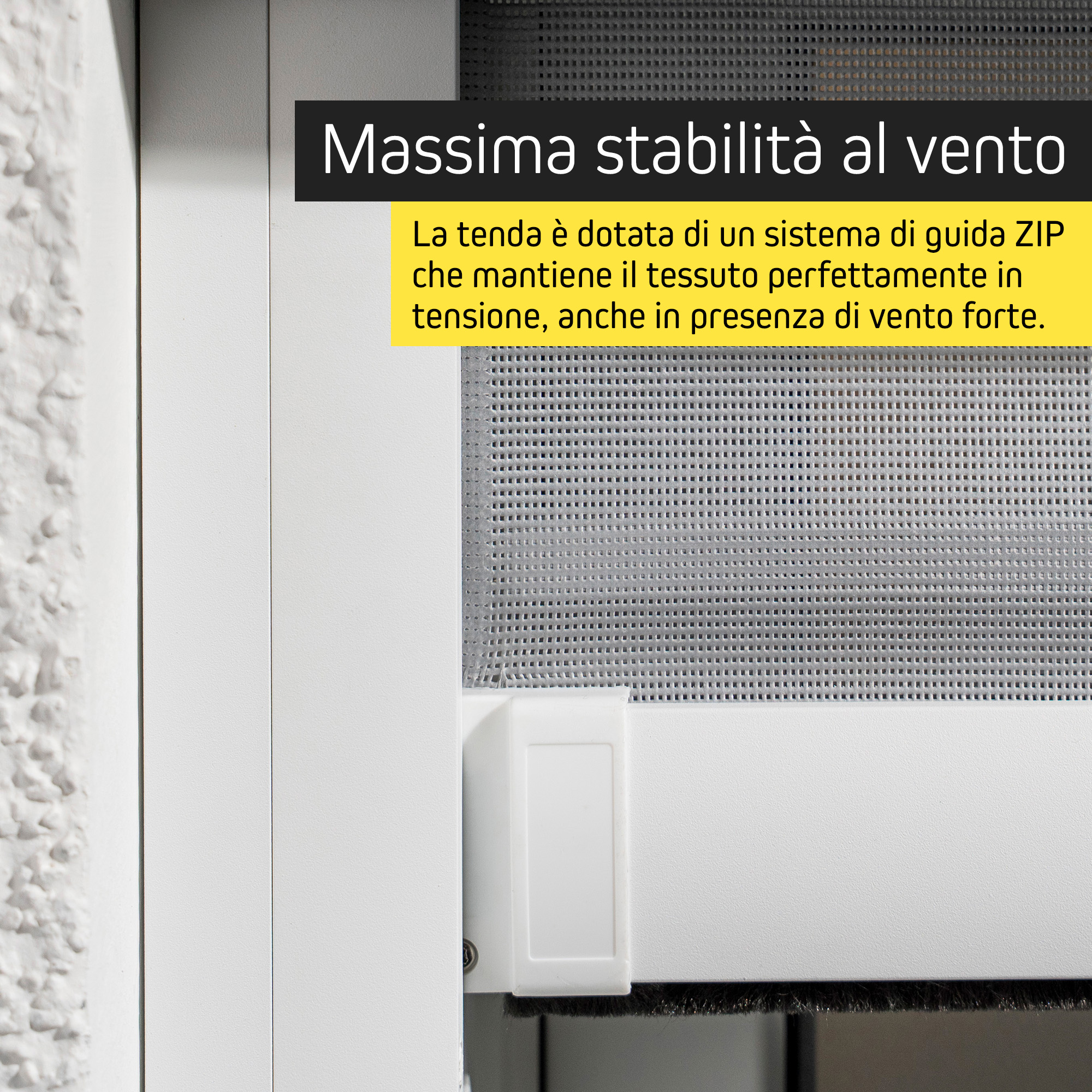 Il vero punto di forza dello Zip-Screen Paramondo è la guida laterale con principio a zip integrato, che mantiene il tessuto sempre perfettamente in tensione. Il risultato è una stabilità elevata, senza vibrazioni, sventolii o rumori fastidiosi, anche in caso di vento.