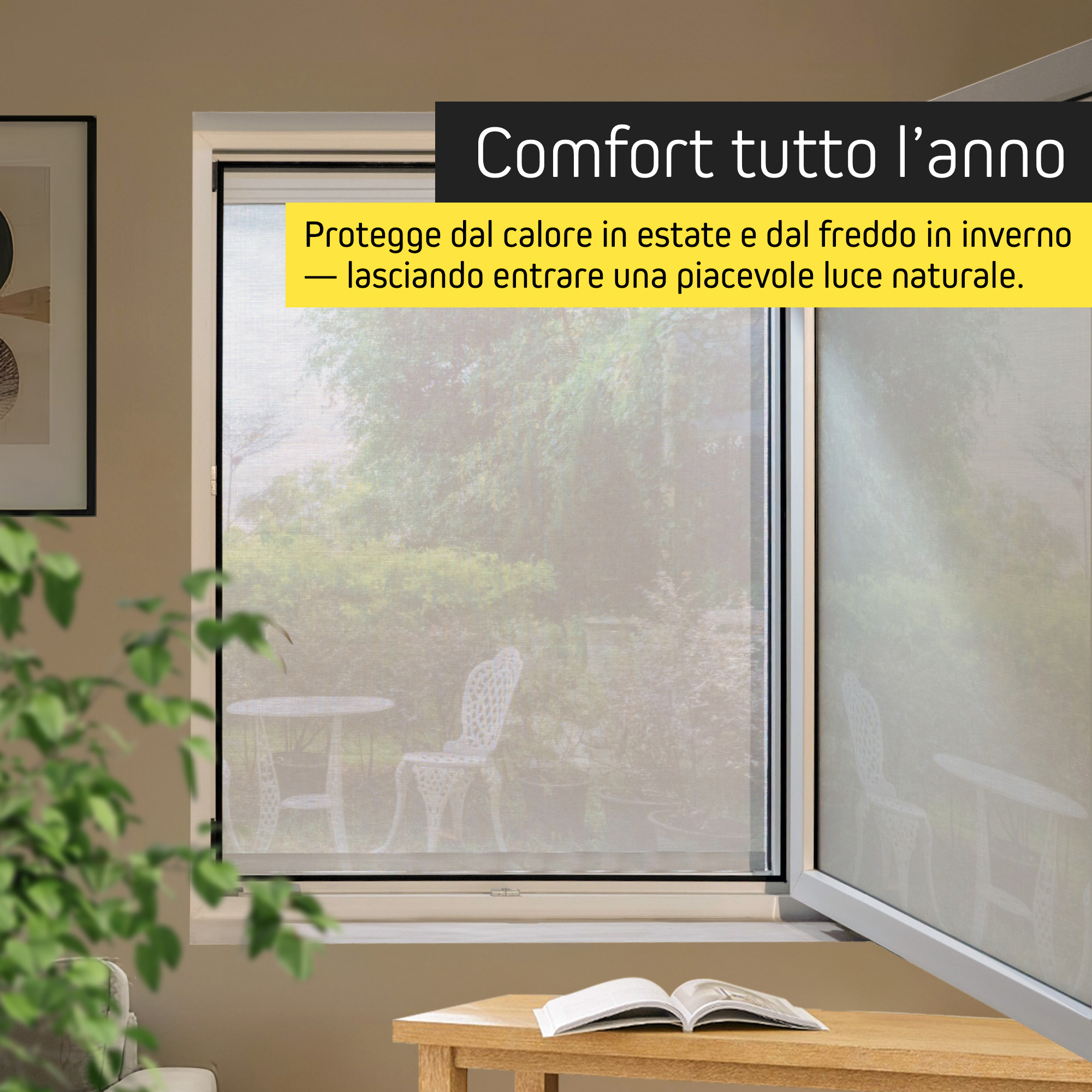 Grazie al resistente tessuto Soltis 86, lo Zip-Screen aiuta a mantenere gli ambienti più freschi in estate, riducendo il surriscaldamento interno. Durante l’inverno contribuisce invece a migliorare l’isolamento termico della finestra, limitando la dispersione di calore. Una soluzione intelligente, pensata per offrire benessere e risparmio energetico in ogni stagione.