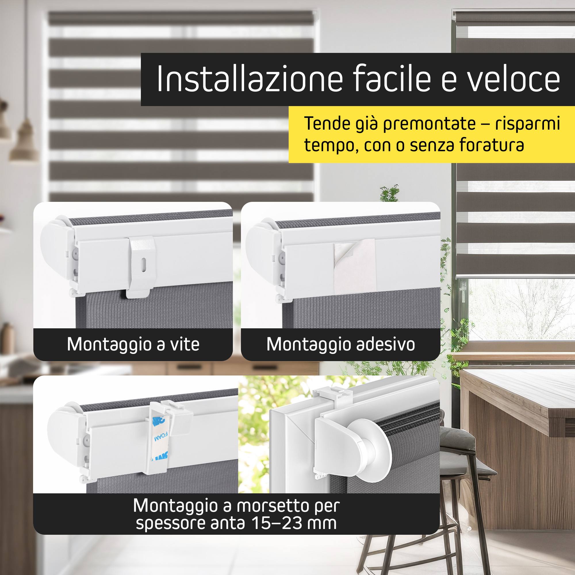 La nostra Tenda Giorno e Notte su misura offre diverse possibilità di installazione: con viti, tramite supporti a morsetto o con adesivo. In questo modo il montaggio risulta semplice, rapido e flessibile.