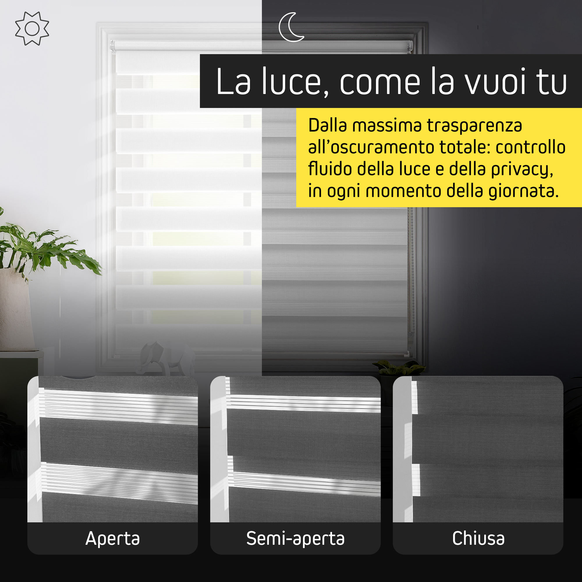 La Eco Tenda Giorno e Notte a rullo su misura è realizzata con due strati di tessuto caratterizzati da bande alternate, opache e trasparenti. Regolando con facilità la loro sovrapposizione, puoi scegliere liberamente la quantità di luce da far entrare nei tuoi ambienti.