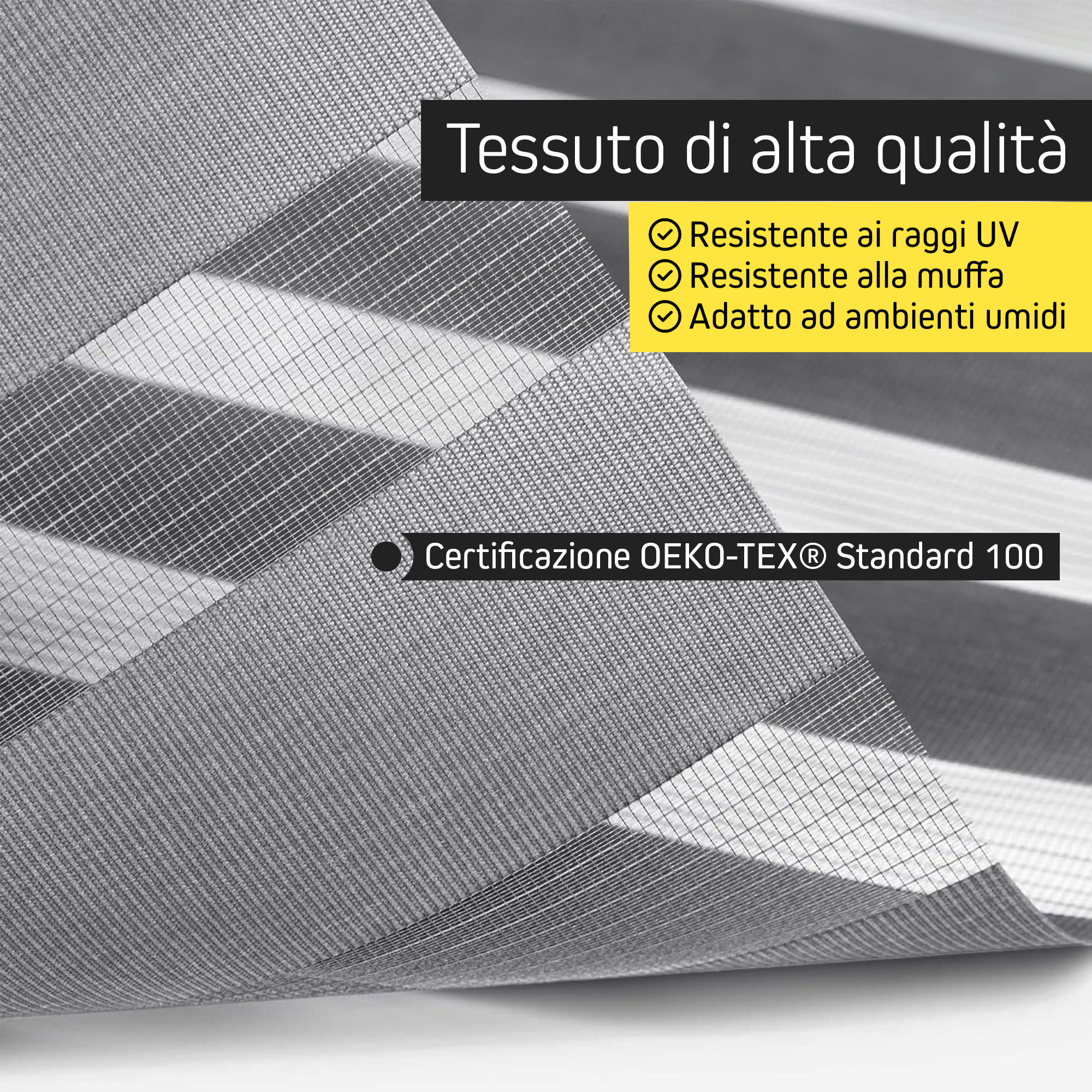 Grazie alla resistenza ai raggi UV, i tessuti mantengono intatta la loro vivacità. La tua Tenda Giorno e Notte resterà luminosa e brillante anche dopo anni di utilizzo, senza rischio di sbiadimento.